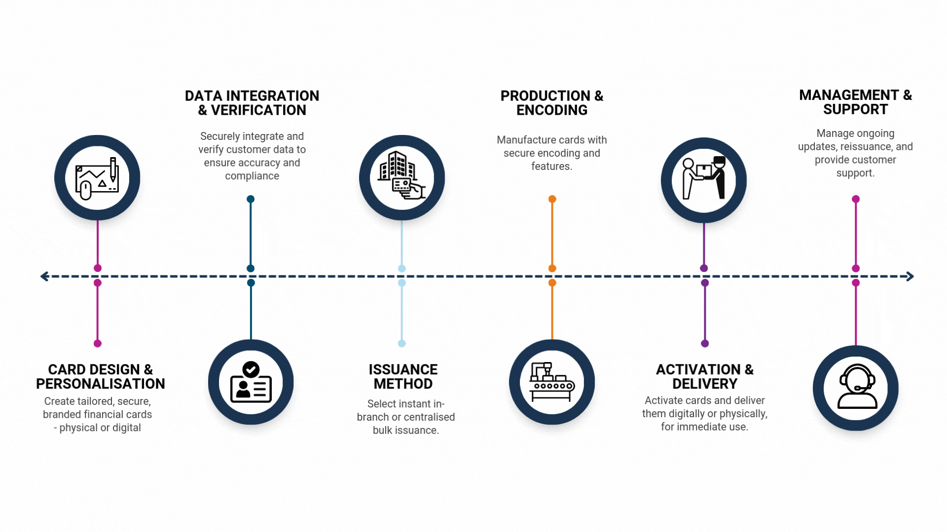 Expand your operations through high-volume card issuance and customisation. This solution is ideally suited for large financial institutions and service bureaus, facilitating mass issuance while maintaining consistent quality, security, and efficiency at every stage of the process.